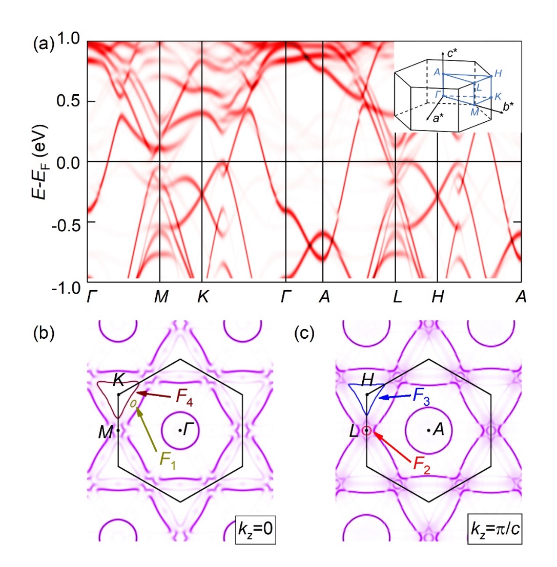 图3. (a) 发生ISD结构畸变后的反折叠能带。插图为原始晶胞的第一布里渊的示意图。(b)和(c) 理论计算频率对应的费米口袋位置。
