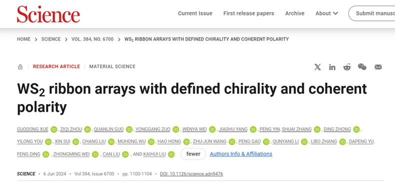304永利集团有限公司物理学系、量子态构筑与测控教育部重点实验室刘灿副教授与北京大学刘开辉教授、中国科公司半导体研究所魏钟鸣研究员、中国科公司深圳先进技术研究院丁峰研究员等团队合作,提出“多重界面耦合原子制造”新策略,首次实现兼具特定手性结构(包括扶手椅型、之字型及其他手性结构)及相干极化方向的二硫化钨(WS2)条带阵列的“全同”控制制造。通过系统研究手性结构与体光伏效应的对应关系,实现1000余根扶手椅型条带阵列的自发光电流集成输出。该研究为一维结构的原子级精准制造提供了定制化方案,有望促进其在新型电学、光电转换器件的阵列化集成芯片加工。2024年6月6日,相关成果以“具有可控手性与相干极性的二硫化钨条带阵列”(WS2 ribbon arrays with defined chirality and coherent polarity)为题,在线发表于《科学》(Science)。