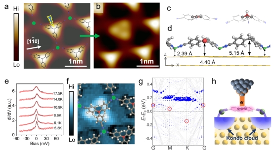 具体地,团队使用非平面的三苯甲基分子(TPM)与Ni原子自组装,在Au(111)衬底上构筑了二维金属有机框架结构,并准确移除了与TPM分子中心sp3碳原子连接的氢原子,获得了单个三甲苯基(π电子)自由基(d-TPM,图2a–2d)。此外,Ni原子进一步稳定了d-TPM自由基的原子结构,也通过d-π杂化进一步增强了其局域磁矩。随后,团队利用扫描隧道电子显微镜,在5.3 K低温条件下观测到了d-TPM自由基上的零偏压电导峰。其展宽随温度降低而变窄(图2e),符合近藤共振峰(Kondo Resonance)特征,拟合得到近藤温度约 40.8 K。