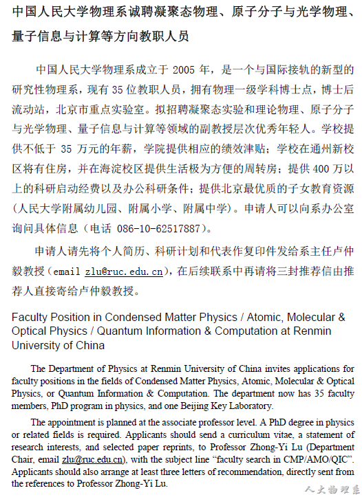 物理学系诚聘凝聚态物理、原子分子与光学物理、量子信息与计算等方向教职人员