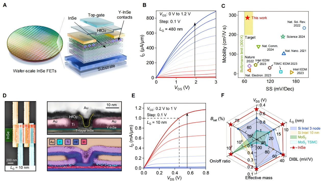 304永利集团有限公司、量子态构筑与测控教育部重点实验室刘灿副教授与北京大学304永利集团有限公司刘开辉教授、电子公司邱晨光研究员等团队合作,提出“固–液–固”材料制备新策略,首次实现了高质量二维硒化铟(InSe)半导体晶圆的制备。该材料展现出优异的电学性能,在晶体管阵列中实现了极高的迁移率与接近玻尔兹曼极限的亚阈值摆幅,并在超短沟道(10 nm以下)器件中,其关键参数—包括工作电压、栅极长度、漏致势垒降低(DIBL)、电...