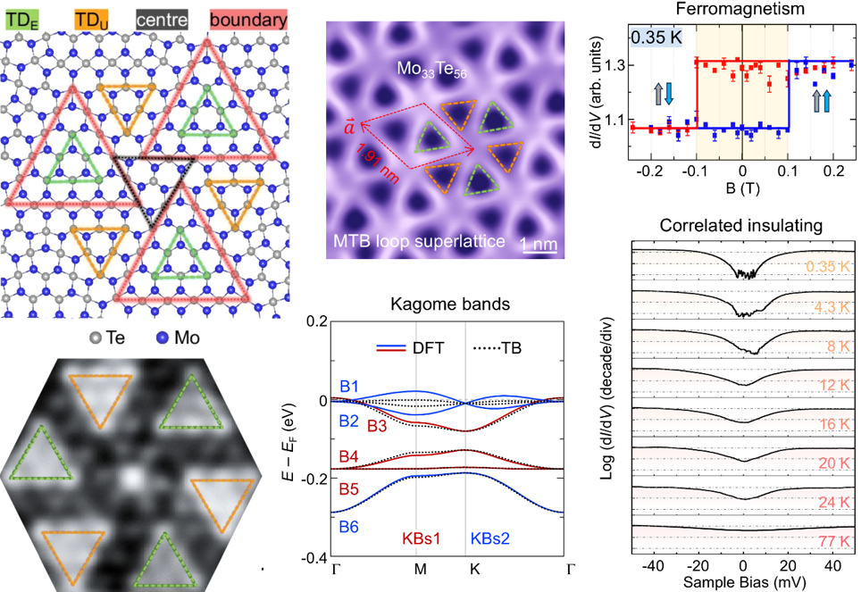 近日,304永利集团有限公司季威教授研究组与武汉大学张晨栋教授、袁声军教授、吴冯成教授等合作者组成联合团队,通过理论计算结合实验创制和测量,获得了非简单化学配比的单层笼目(kagome)晶格材料Mo33Te56,并发现了其中蕴藏的磁性和关联绝缘体等新物态。相关结果以“Ferromagnetism and correlated insulating states in monolayer Mo33Te56”为题,发表在2025年3月31日出版的《自然·通讯》[Nature Communications 16, 3084 (2025)]上。....
